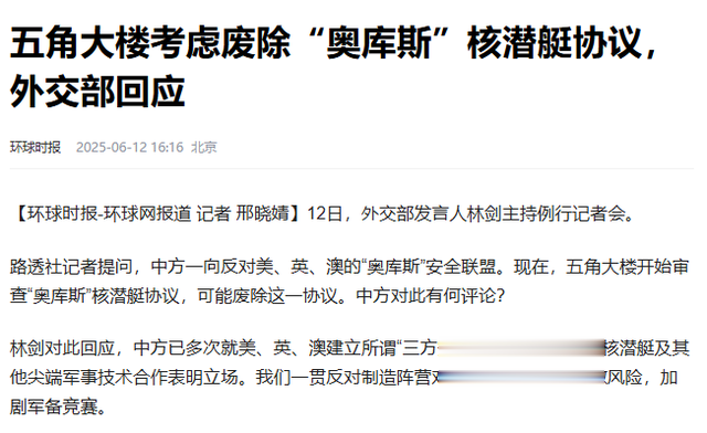 2025年5月五角大楼发布的《中国军力报告》承认,在“奥库斯”重点发展的23项技术中,中国有19项处于领先地位,特别是在高超音速武器、水下无人潜航器和声学传感器领域。即便美英澳技术叠加,中国在多个关键领域依然保持优势。